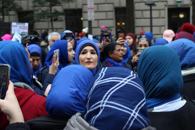 As the protesters gathered before the march, prominent Muslim activist Linda Sarsour urged the women to be proud of their faith and contributions to society in the United States.