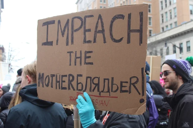 One woman marched with a sign that echoed Congresswoman Rashida Tlaib's call to "impeach the mother****er," referring to Trump. The latter part of the word, however, appeared in Russian - a nod to the ongoing investigation of possible collusion between the Trump campaign and Russia during the 2016 election.