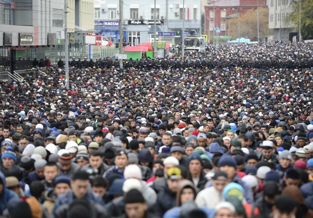 Muslims living in Moscow perform Eid al-Adha prayer at the square and streets surrounding the Central Mosque (AA)