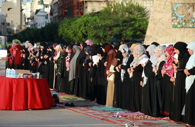 Women in Libya line up for the Eid prayer at in Tripoli, Libya on October 04