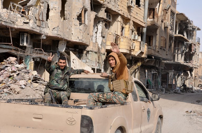 Pro-government forces posing inside Deir Ezzor after fighting with IS militants (AFP)