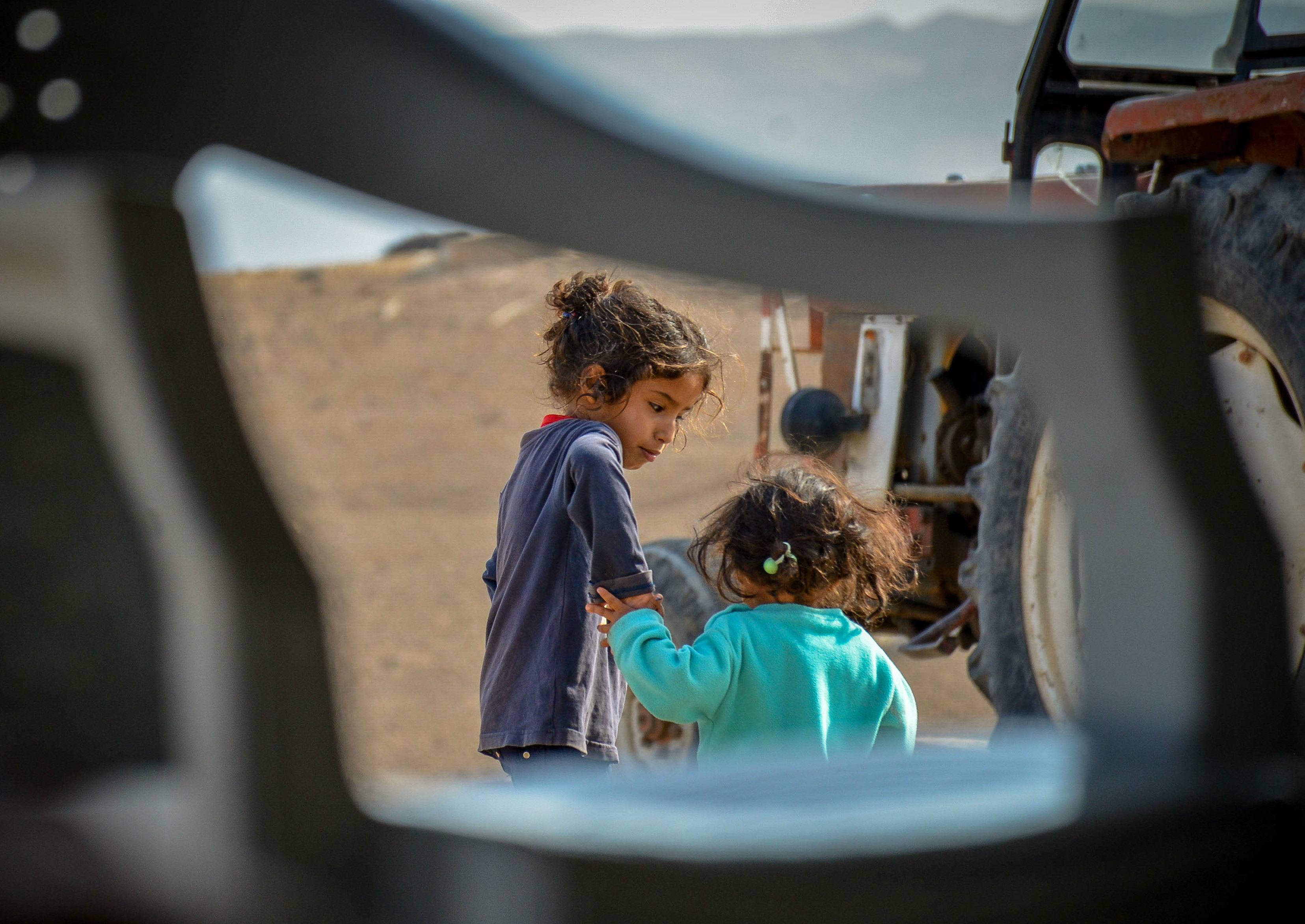 Several schoolgirls walking down a dirt road pass by a little boy guiding a small herd of sheep back to one of the barracks, where 32-year-old Farhan Ghawanmeh checks a water tank.