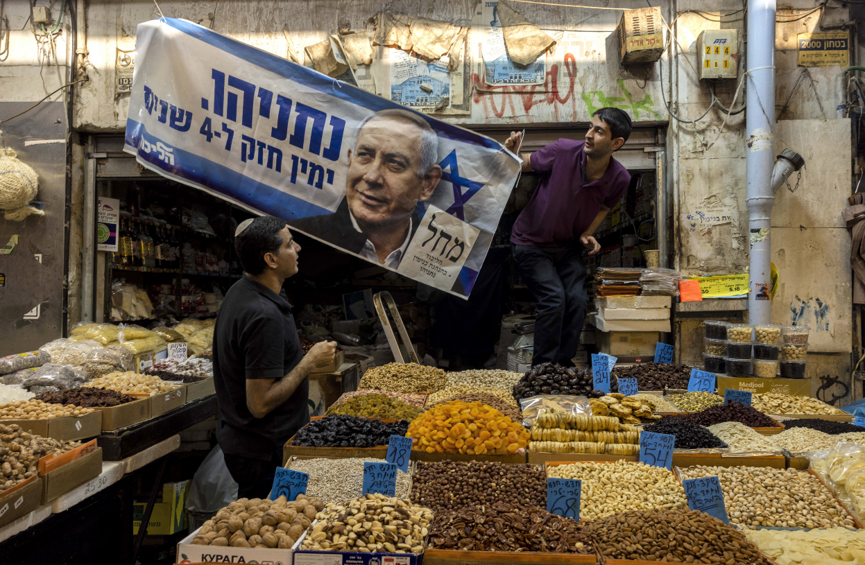 An electoral banner for Israel's Likud party, depicting its leader and former prime minister Benjamin Netanyahu, is hung above a nut and dried fruit stall at the Mahane Yehuda market in Jerusalem, on 31 October 2022 (AFP)
