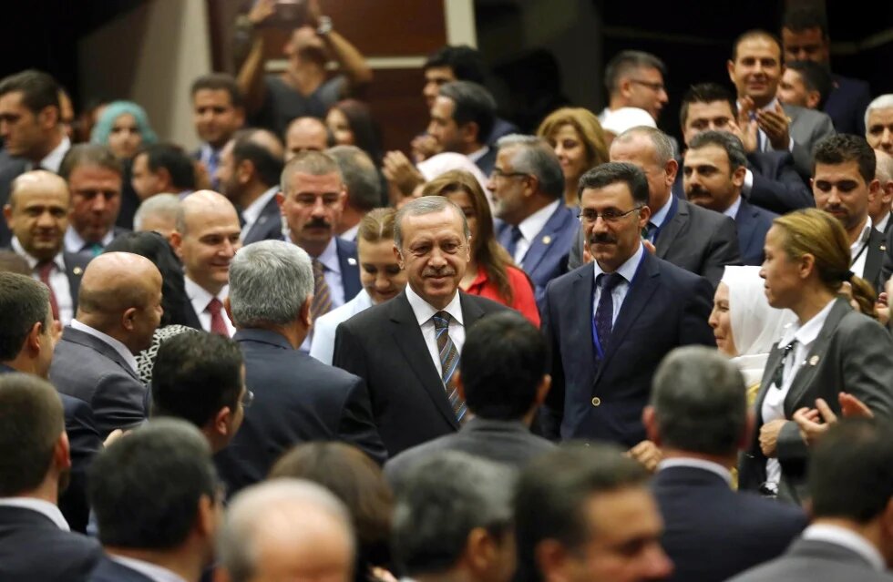 Turkey's president-elect Erdogan stands among members of his ruling AK Party during a meeting at the party headquarters in Ankara on August 14, 2014