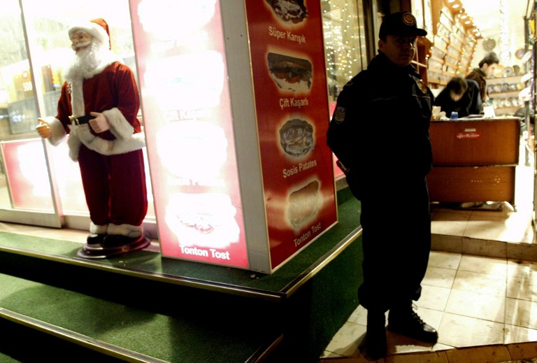 A Turkish policeman stands guard outside a restaurant in Istiklal street, downtown Istanbul on New Year's Eve 2016 (AFP)