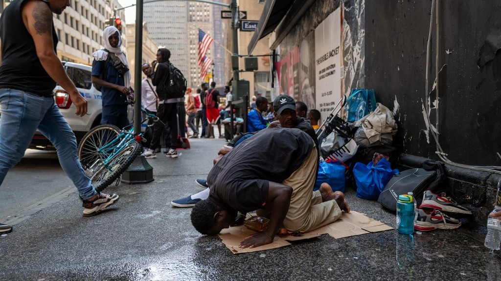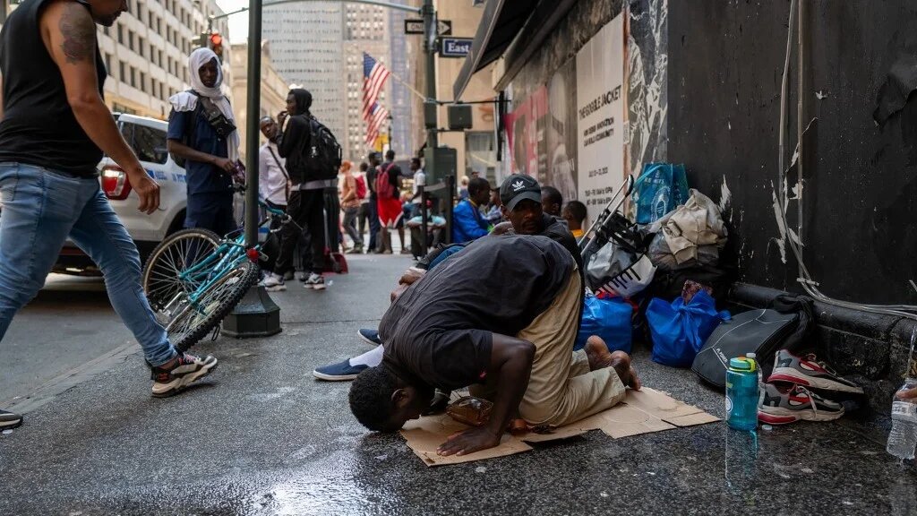 Hundreds of migrants sleep shoulder to shoulder on the sidewalk outside the Roosevelt Hotel in Midtown Manhattan for days, hoping the city will eventually help them. The Roosevelt Hotel serves as an initial processing point for individuals before they are dispatched to various shelters across the city. However, these shelters now report being full.