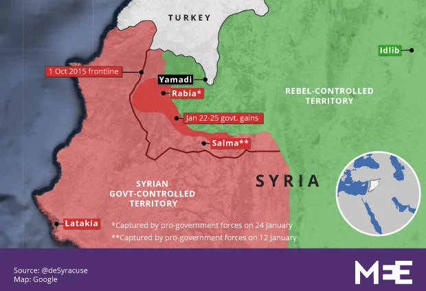 In November, Russian jets bombed camps including Yamadi in the Turkmen Mountain region of northern Latakia that had become refuges for Syrians fleeing from war-shattered cities, including long-besieged Homs and Aleppo, and Ariha in Idlib province.