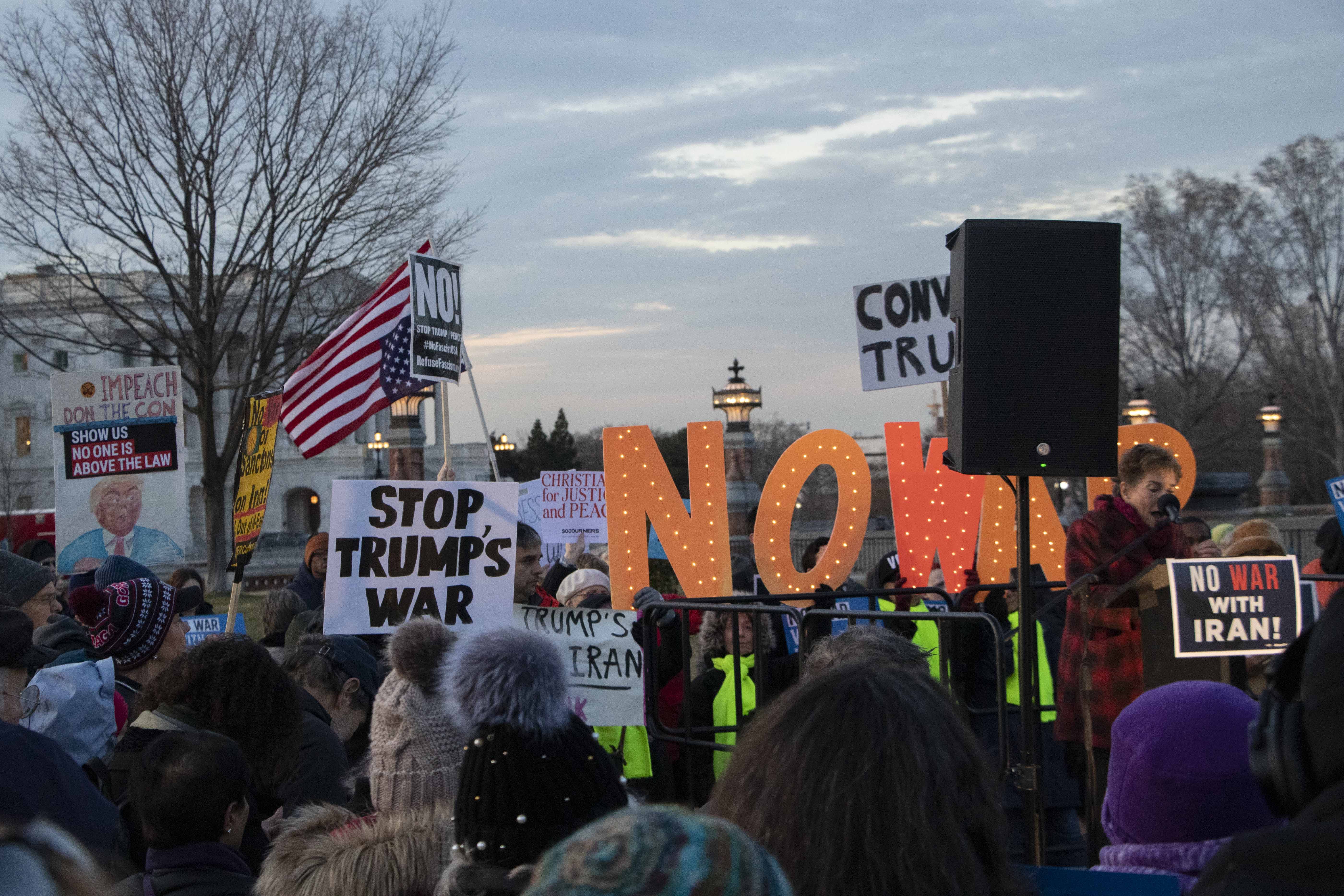 It may have been a cold winter day in Washington, but that did not deter demonstrators from arriving in large numbers with signs proclaiming "No war with Iran" and chanting the same slogan.