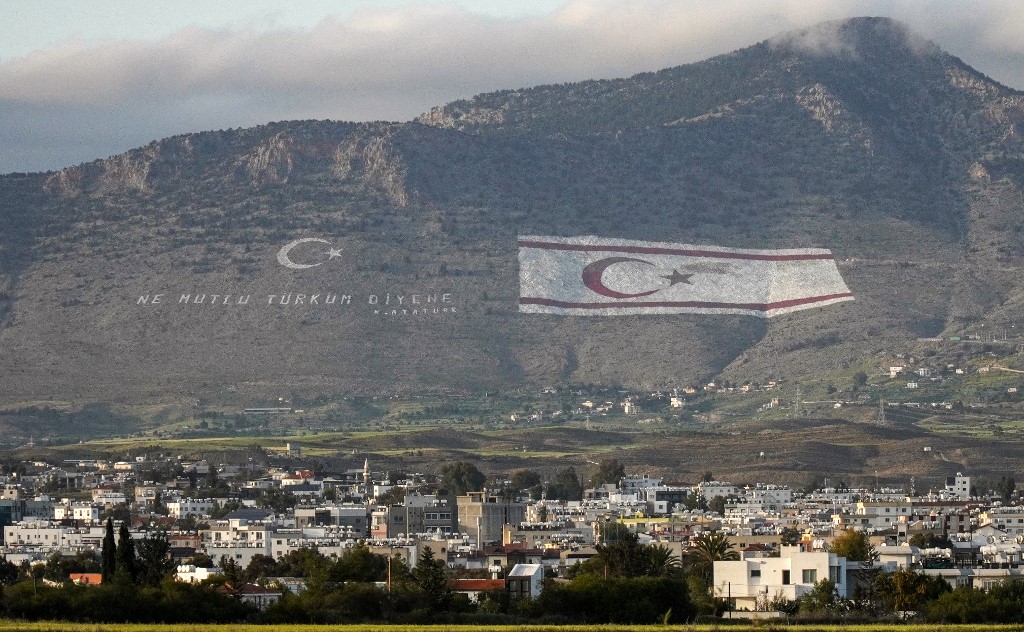 The Kyrenia mountain range, north of the divided Cypriot capital, with the flags of Turkey and the Turkish Republic of Northern Cyprus (TRNC) painted on the mountain overlooking Nicosia (Roy ISSA/AFP)