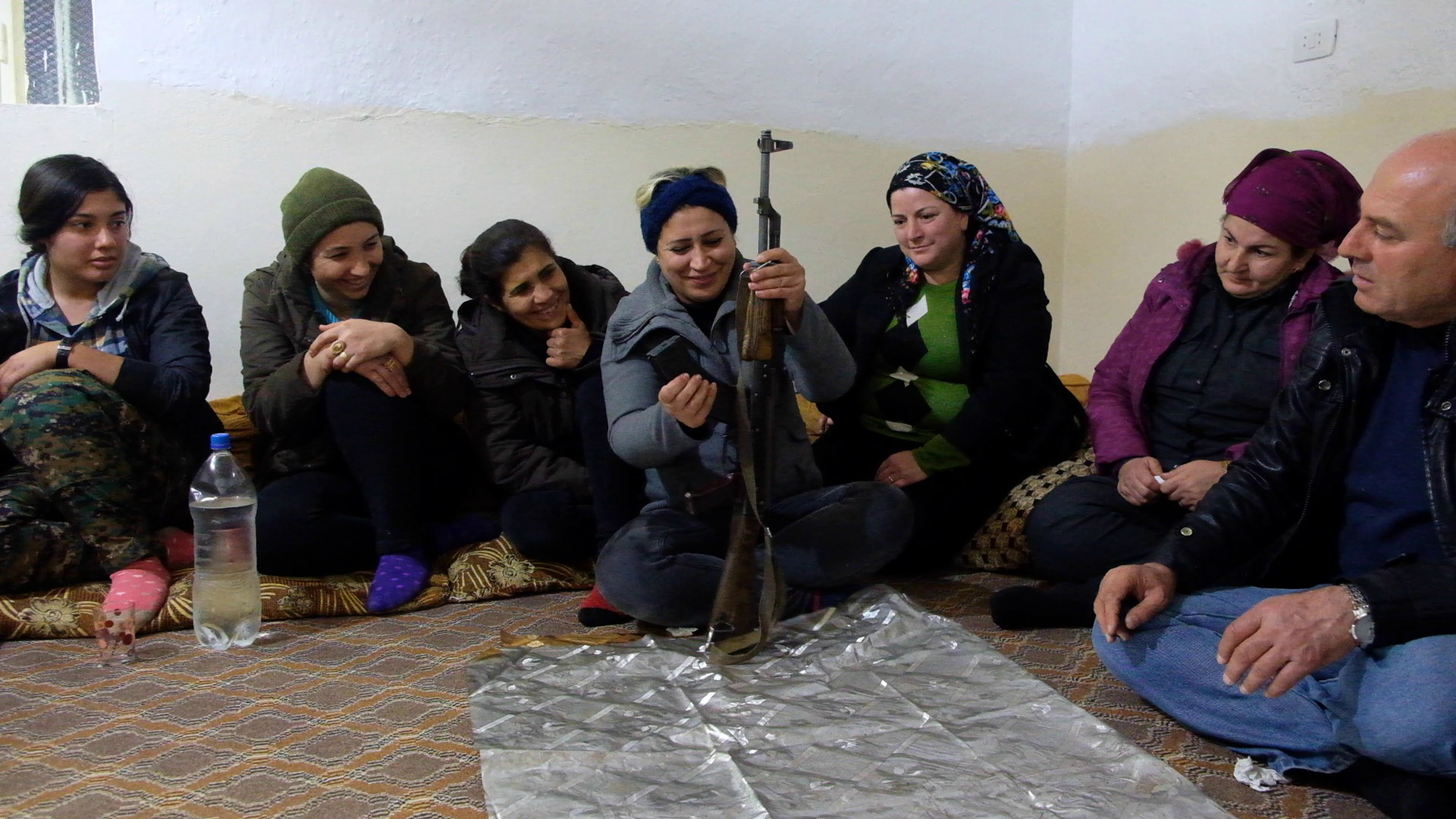 A group of female volunteers from the HPC-Jin organisation (Civilian Defence Forces - Women) are meeting with other women from the community and are giving them basic training, showing them how to mount and dismount an AK-47, as well as how to use the assault rifle safely.