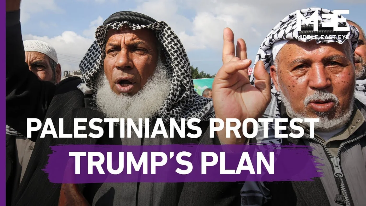 Holding anti-Trump placards, members of Fatah, Hamas and the Popular Front for the Liberation of Palestine marched together through Gaza, hours before Trump, alongside Israeli Prime Minister Benjamin Netanyahu, reveals his plan to address the Israeli-Palestinian conflict.