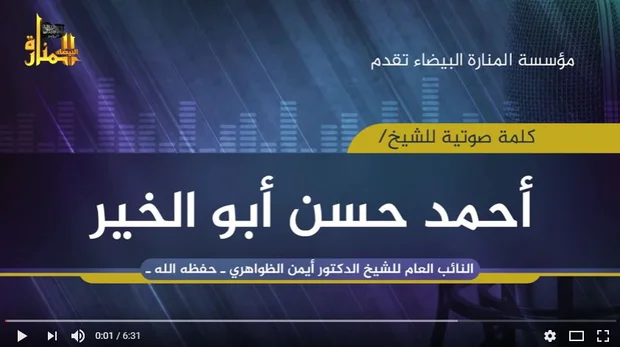 A screengrab of al-Qaeda's audio message, reading ‘A sound recording by Sheikh Ahmed Hassan Abu Kheir’ (YouTube)