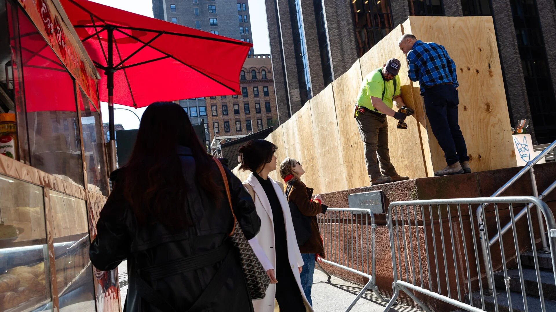 Several passersby stopped, took photos, and mocked what they called a pathetic response from the university to quell free speech. Some also plastered small Palestine stickers onto the wall while "NYU Wall of Shame" could be seen faintly written across the wooden facade.