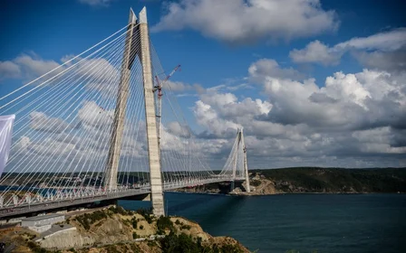 A drilling rig passes close to the 15th July Martyrs Bridge on the Bosphorus strait en route to the Black Sea, in Istanbul, on 29 August 2019 (AFP)