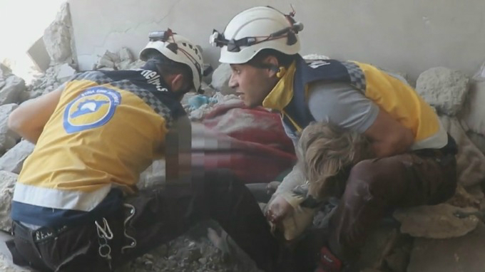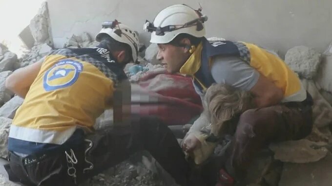 "He's here, help us for God's sake," the brothers cried as White Helmets, members of the civil defence team that operates in rebel-held areas of Syria, arrived at the scene and desperately tried to remove broken pieces of stone to find him.