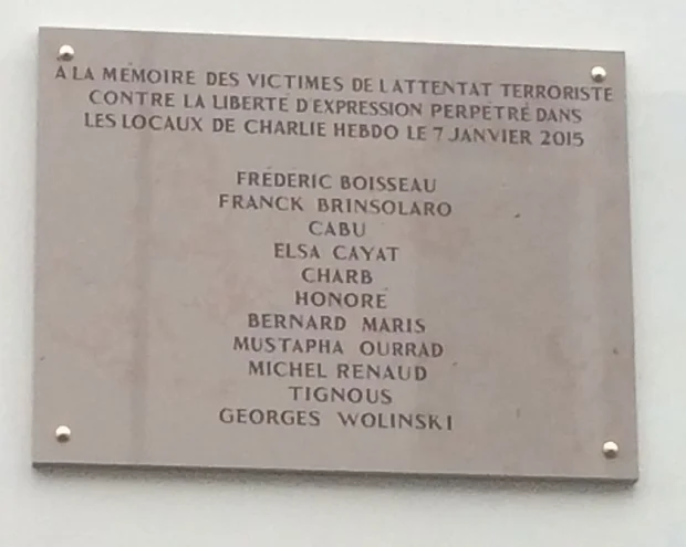 Today, a few people and journalists stand in front of a commemorative plaque, paying tribute to the victims of the “terrorist attack against freedom of expression”, as the marble sign reads. Only a couple of flowers lie underneath.