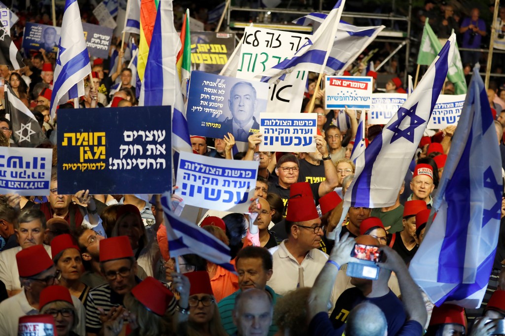 Thousands of Israelis gathered in Tel Aviv on Saturday night to protest Prime Minister Benjamin Netanyahu's emerging coalition agreements, which opposition leaders say may lead to the end of the country's democracy.