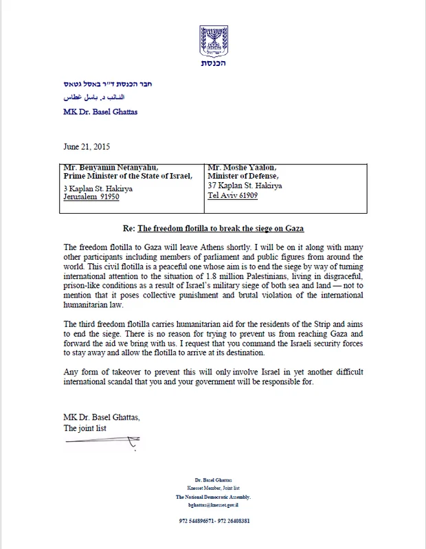 In a letter directed to Israeli Prime Minister Benjamin Netanayahu, Ghattas called on Israel to allow the flotilla to reach its destination and warned against any takeover.