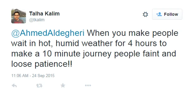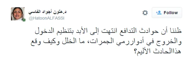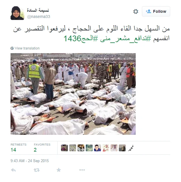 Translation: It is very easy [for the authorities] to shift the blame onto pilgrims to deflect criticism from themselves Iran, Saudi Arabia's long-time foe, waded into the debate on Thursday afternoon after at least 43 of its citizens were found to have died in the crush.The head of Iran's Hajj body, Said Ohadi, told Iranian state television that the stampede was caused by a decision to close a path near the stoning site "for unknown reasons".