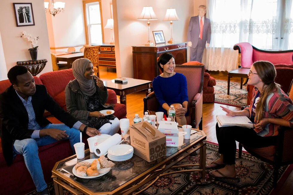 Aid agency Oxfam said it rented the house and invited refugees from Somalia, Vietnam and Syria as guests to call on Trump and other world leaders to do more to support refugees as they gather in New York for the UN General Assembly this week.