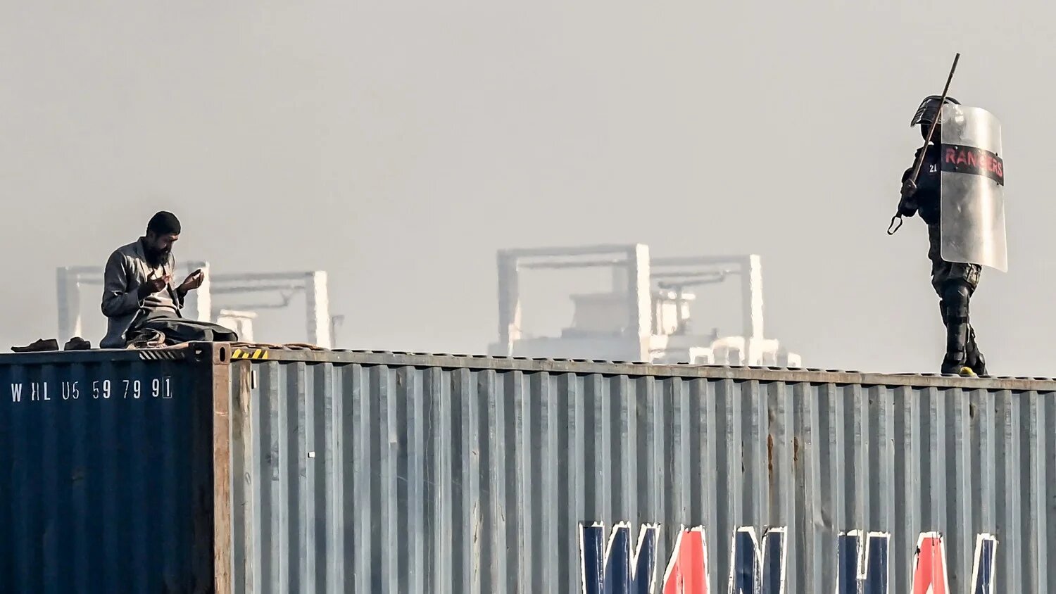 In a video circulating on social media, the man was seen praying on top of the container stack before a member of the security forces pushed him off, causing him to cling to the edge of the container before falling seven metres onto the ground. His condition is unknown.
