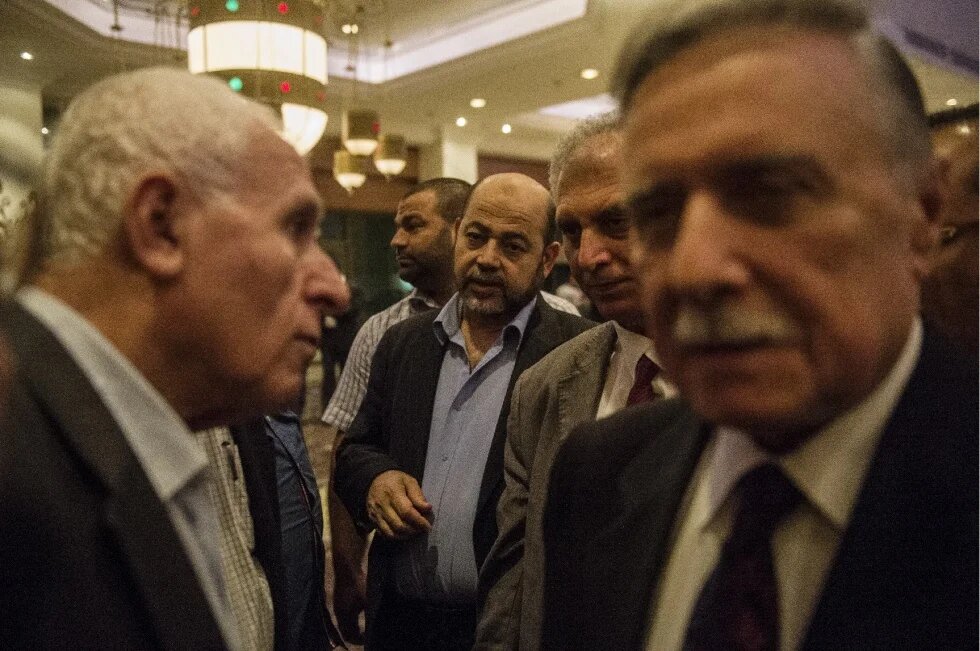 The Palestinian delegation, headed by Musa Abu Marzouk (C) in Cairo on 11 August (AFP)