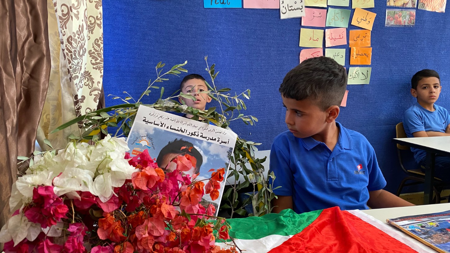 Items commemorating Rayyan Sulaiman sit on his classroom desk: a portrait, flowers, the Palestinian flag.