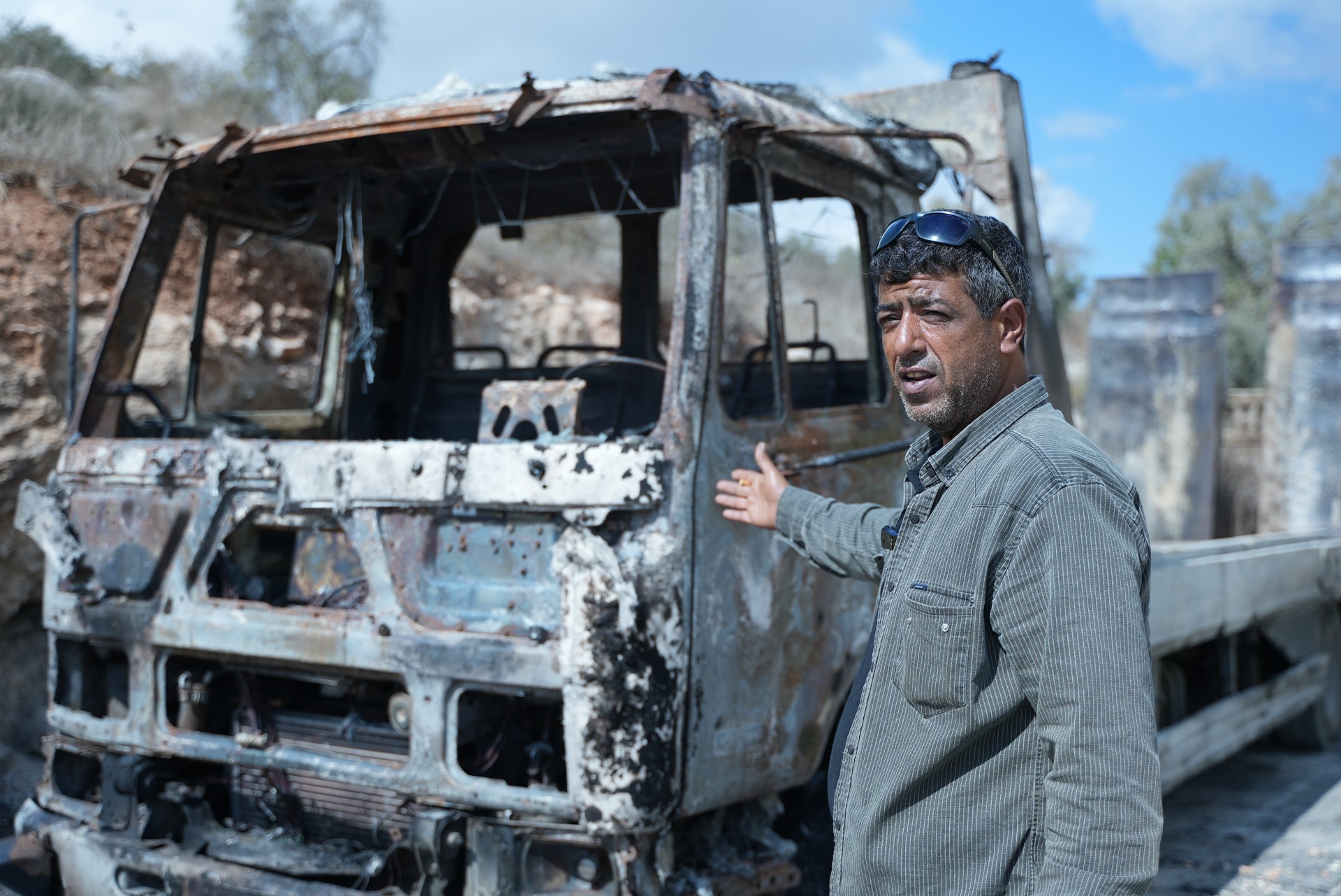 "While the soldiers were pushing us back and attacking us, the settlers started to set fire to one of our vans that was parked higher up on the hill, while another group of them came and started to set fire to one of our lorries.
