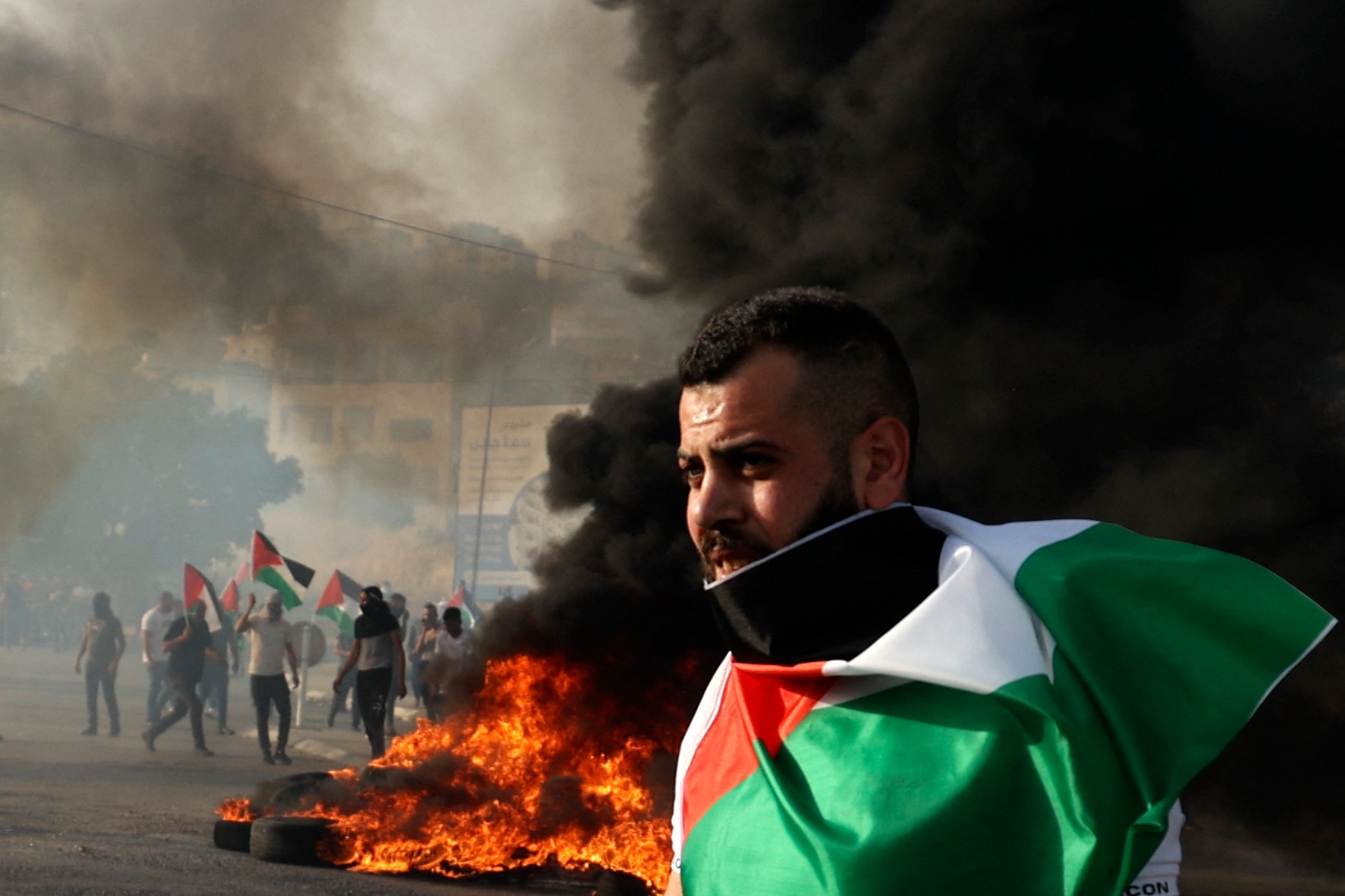 A Palestinian protester at a demonstration outside the Huwara military checkpoint near Nablus in the occupied West Bank on 29 May 2022. (AFP)