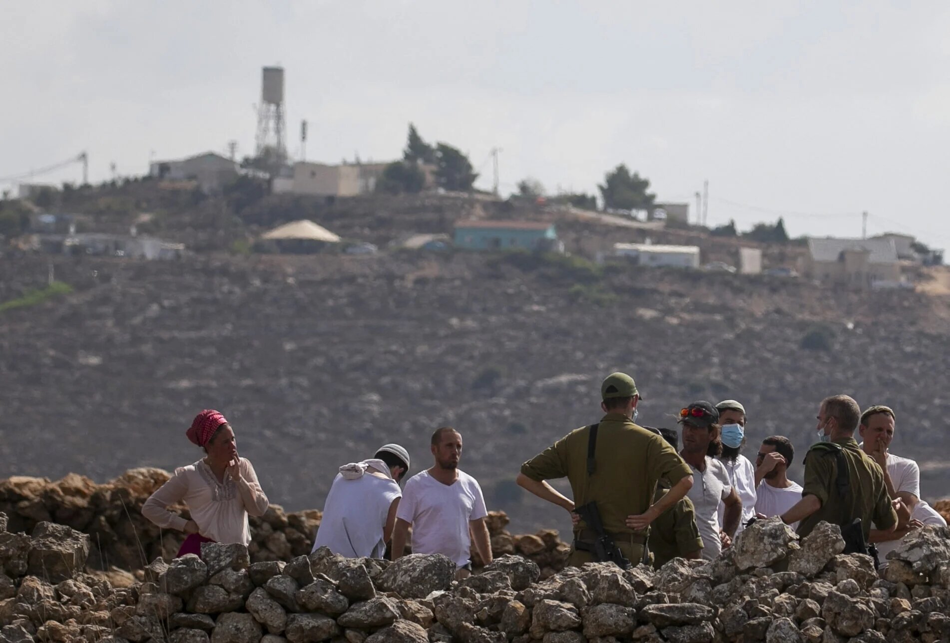 Israeli soldiers speak with settlers from the Esh Kodesh outpost during a reported attack on farms in the Palestinian village of Qusra in the occupied West Bank on 26 September 2020 (AFP)