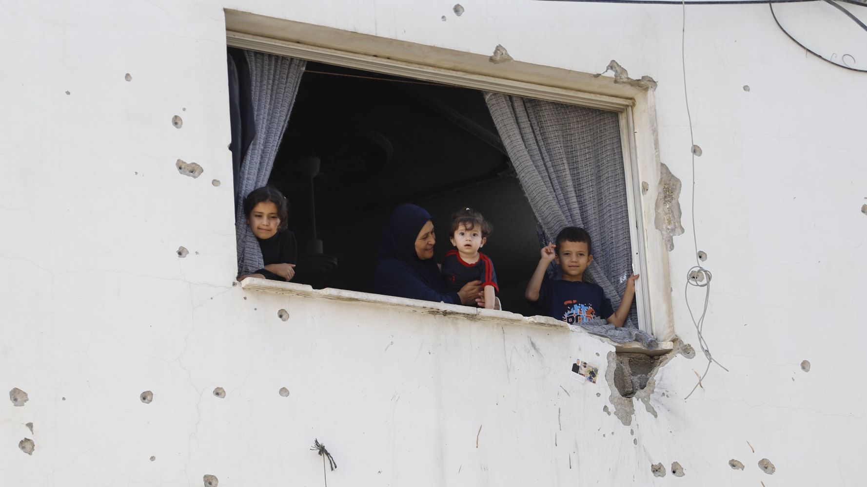 The Wahdan family peer out of their home which is pockmarked with bullet holes (MEE/Aziza Nofal)