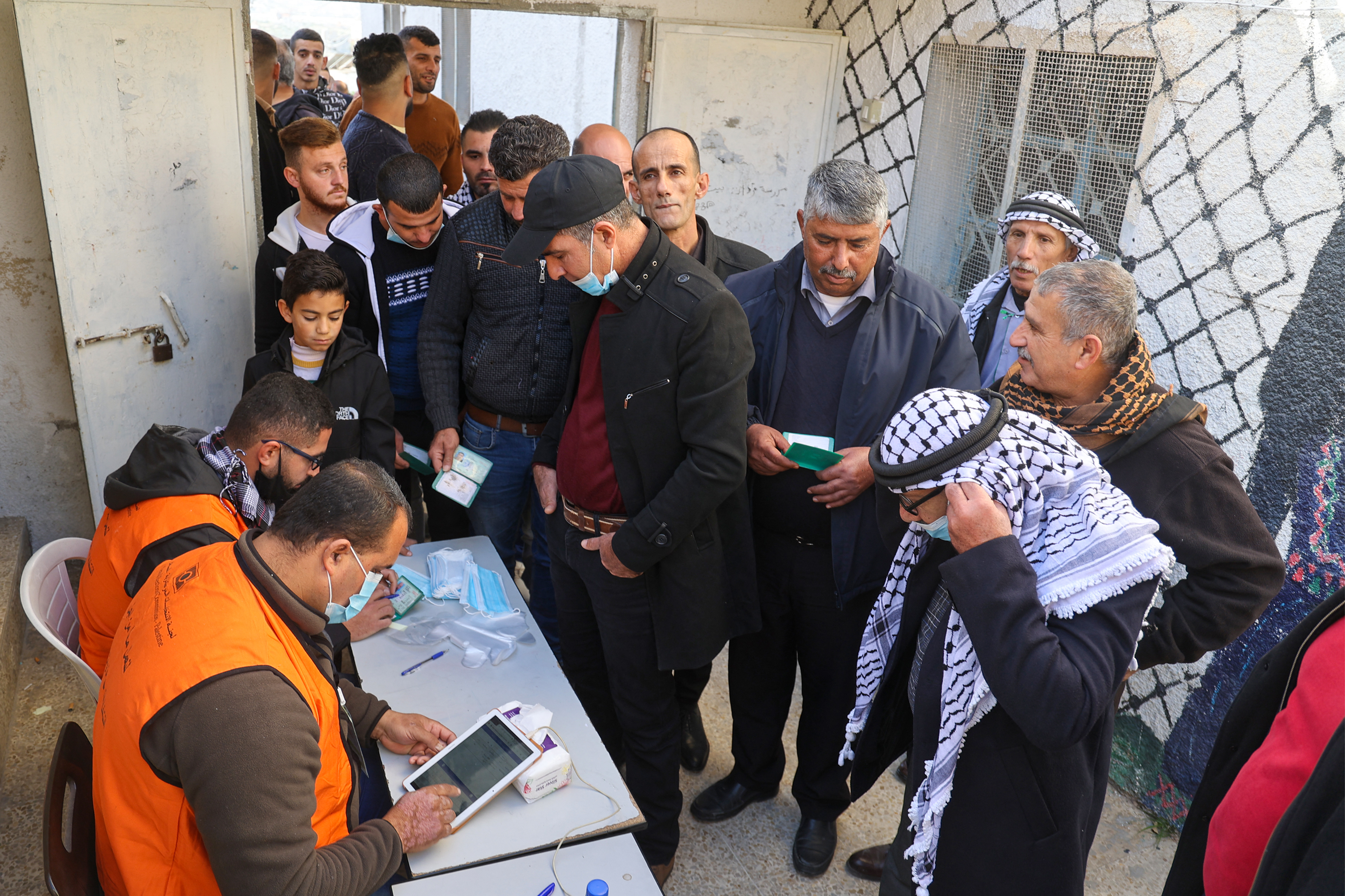 Palestinians outside a polling station in Beit Dajan, east of Nablus in the occupied West Bank, December 12 2021 (AFP)
