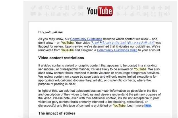 Al-Quds staff attempting to log in to the account on Friday were directed to a page stating that the account had been terminated because of violations of YouTube's community guidelines.