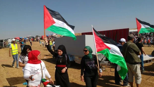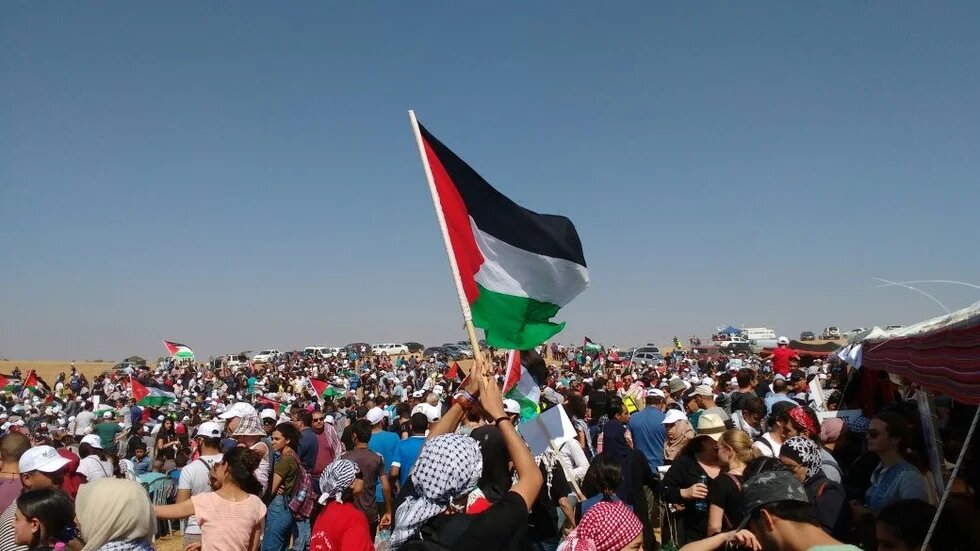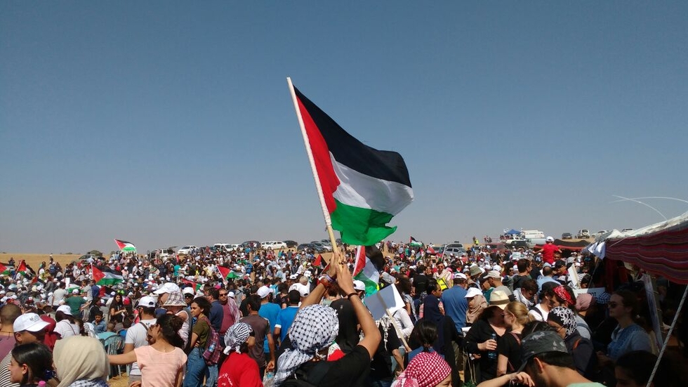 A sea of Palestinian flags fluttered in the wind as thousands of people defiantly strode through the desert near the Bedouin village of Rahat, with many holding signs demanding that millions of Palestinian refugees be allowed to return to homes taken by Israel.