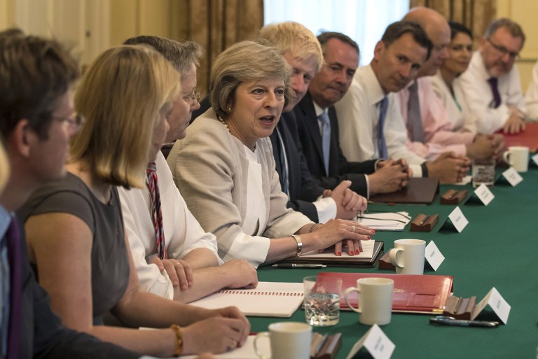 Theresa May (C) chairs her first cabinet meeting on 19 July. As home secretary she oversaw the Prevent strategy (AFP)