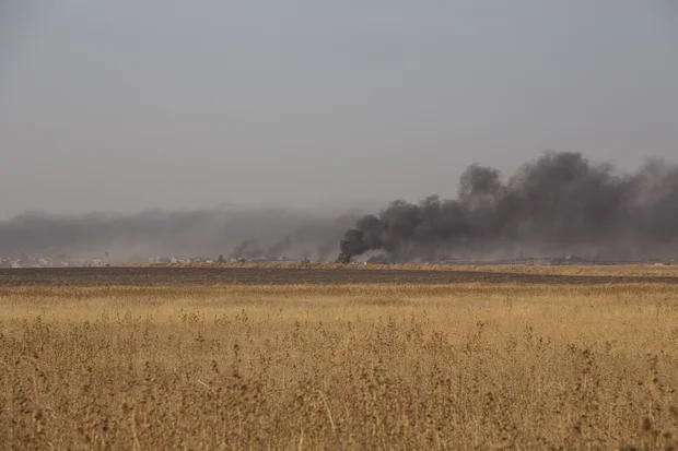 The red, white and green flags of Iraq's Kurdish region flap in the wind atop the rolling combat vehicles. Then the rhythmic hum of their engines is drowned out by the staccato scream of machinegun fire, the thud of mortar bombs and the roar of coalition jets across the sky.