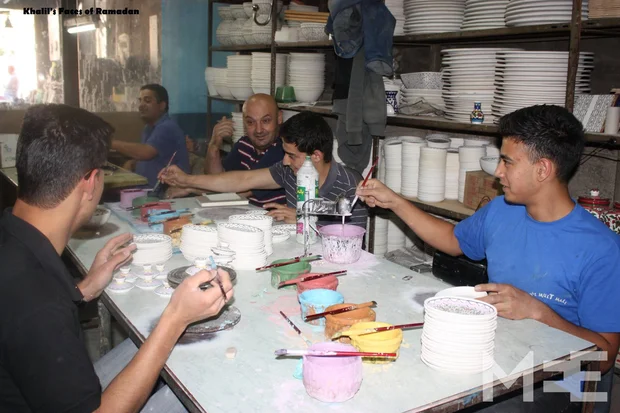 This picture shows a relative of Abu Khaled Al Natsha who also works in the same factory. He warmly invited us into the room where the workers (all cousins) drew and painted pottery. He said their art was taught to them by their grandparents and was a much loved tradition. They don't slow down even in Ramadan and the beauty they create is as powerful as a prayer.