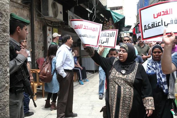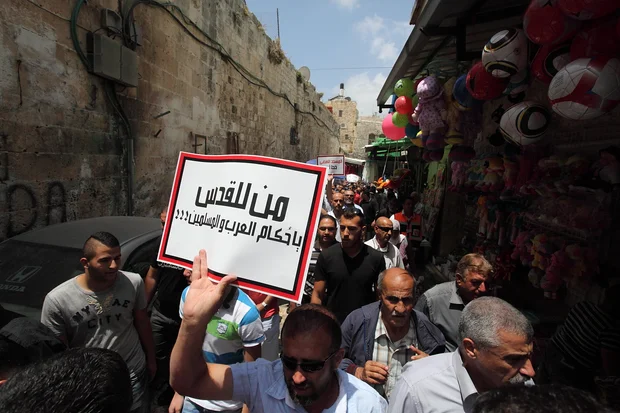 To mark the anniversary of the Israeli occupation of East Jerusalem, protesters march through the Old City on Friday