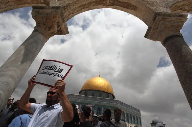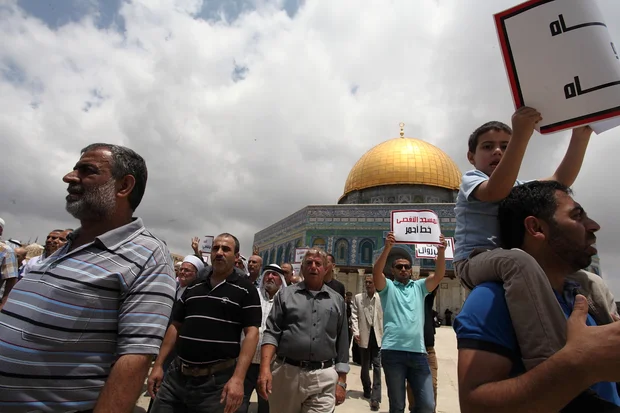 Protesters gather at al-Aqsa Mosque in the Old City for the Global March to Jerusalem (MEE/Tarek Tawfik)