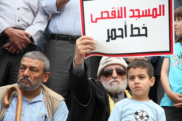 A protester holds a banner that reads 'al-Aqsa Mosque is a read line' (MEE/Tarek Tawfik)