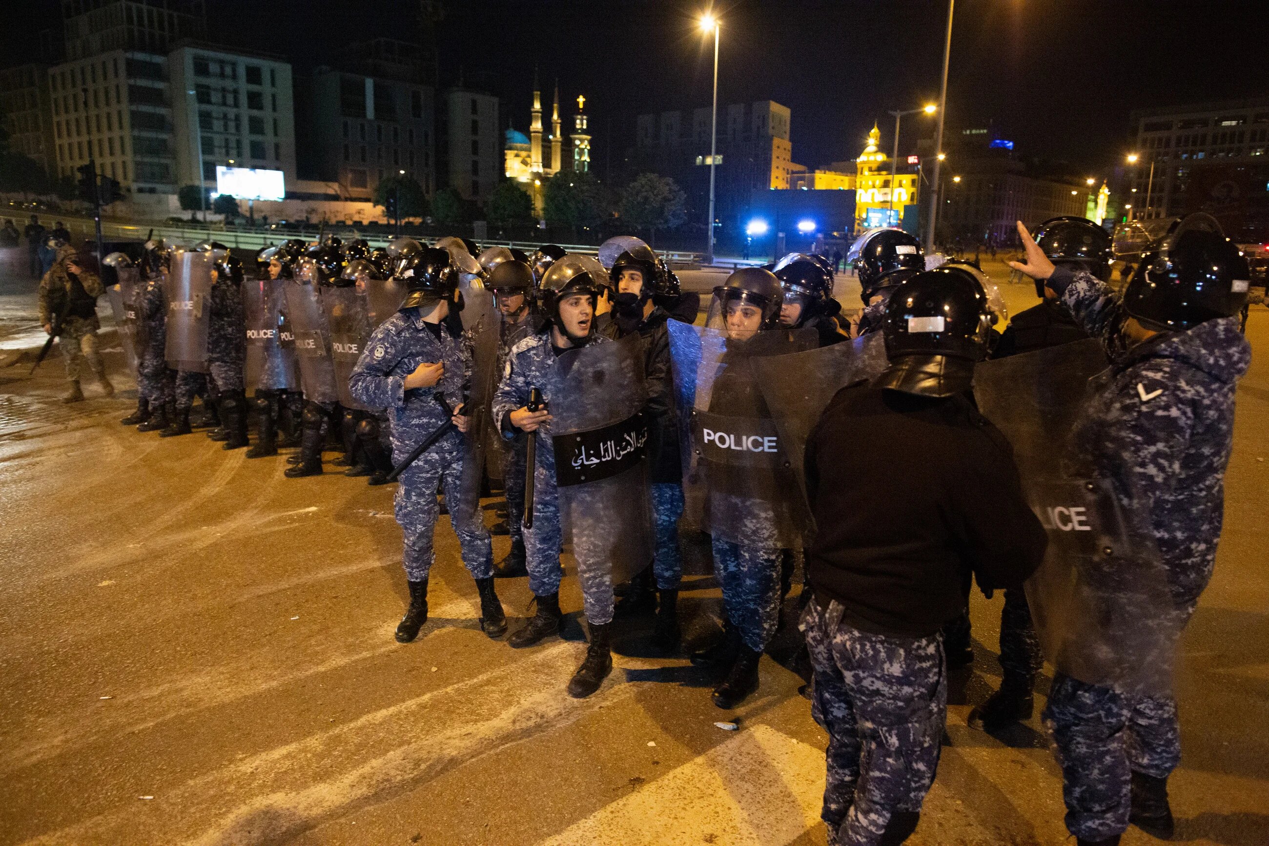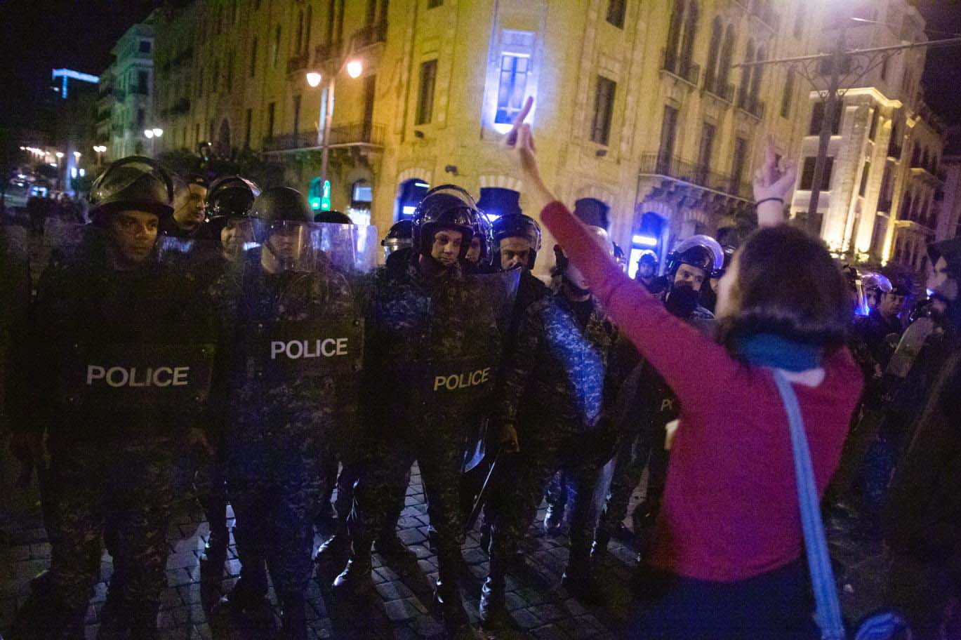 Riot police stand in formation in front of anti-government protesters on the corner of Martyrs’ Square. Internal Security Forces and members of the parliamentary police force had beaten and detained several protesters on 14 December. The Lebanese Civil Defence said 54 people were treated for wounds (MEE/Sam Tarling)