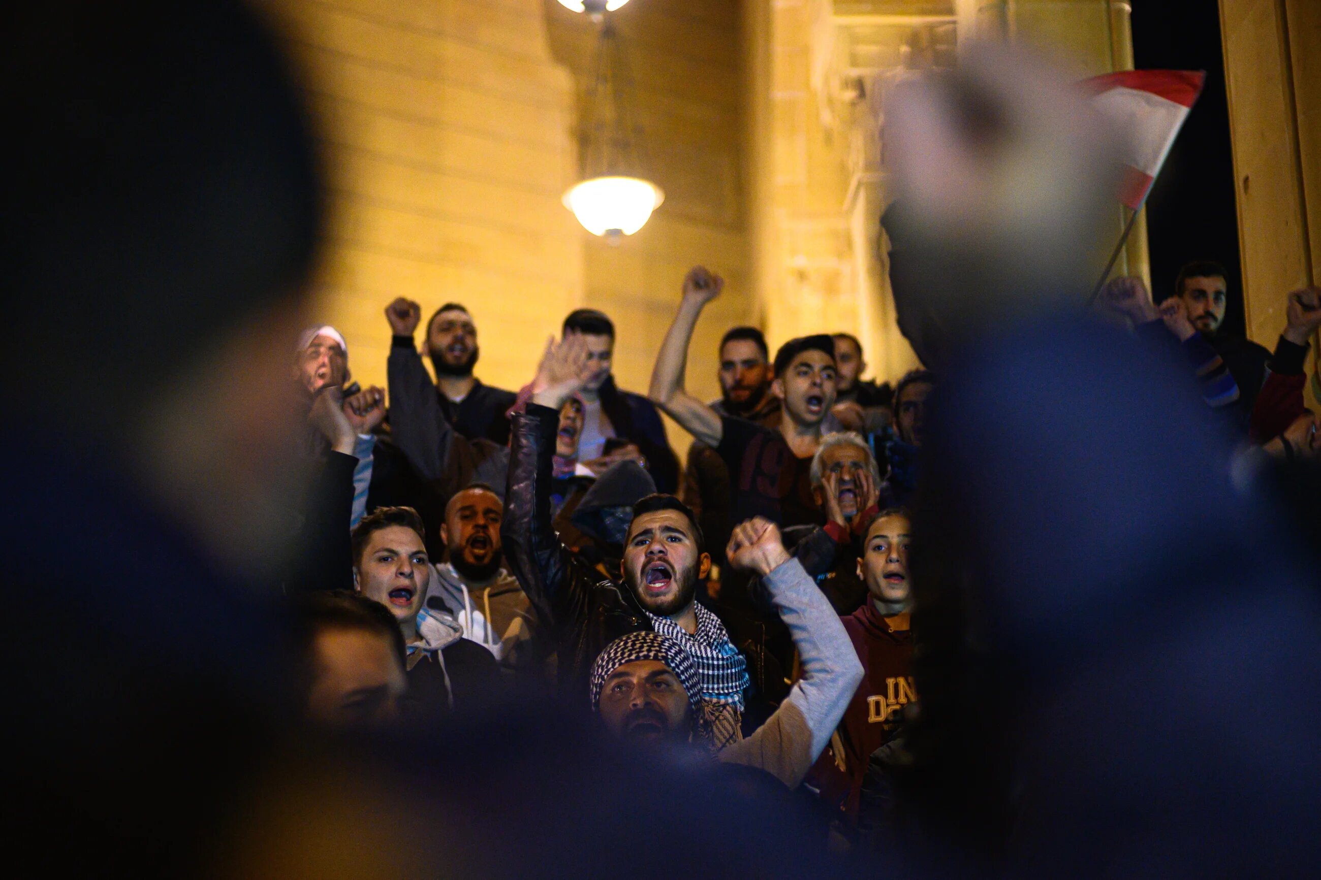 A group of men from Tripoli assemble on the steps of Beirut’s Mohammad al-Amin Mosque and chant in support of fellow protesters from other parts of the country, having journeyed from the northern city on 15 December to lend their weight to protests in Beirut (MEE/Finbar Anderson)
