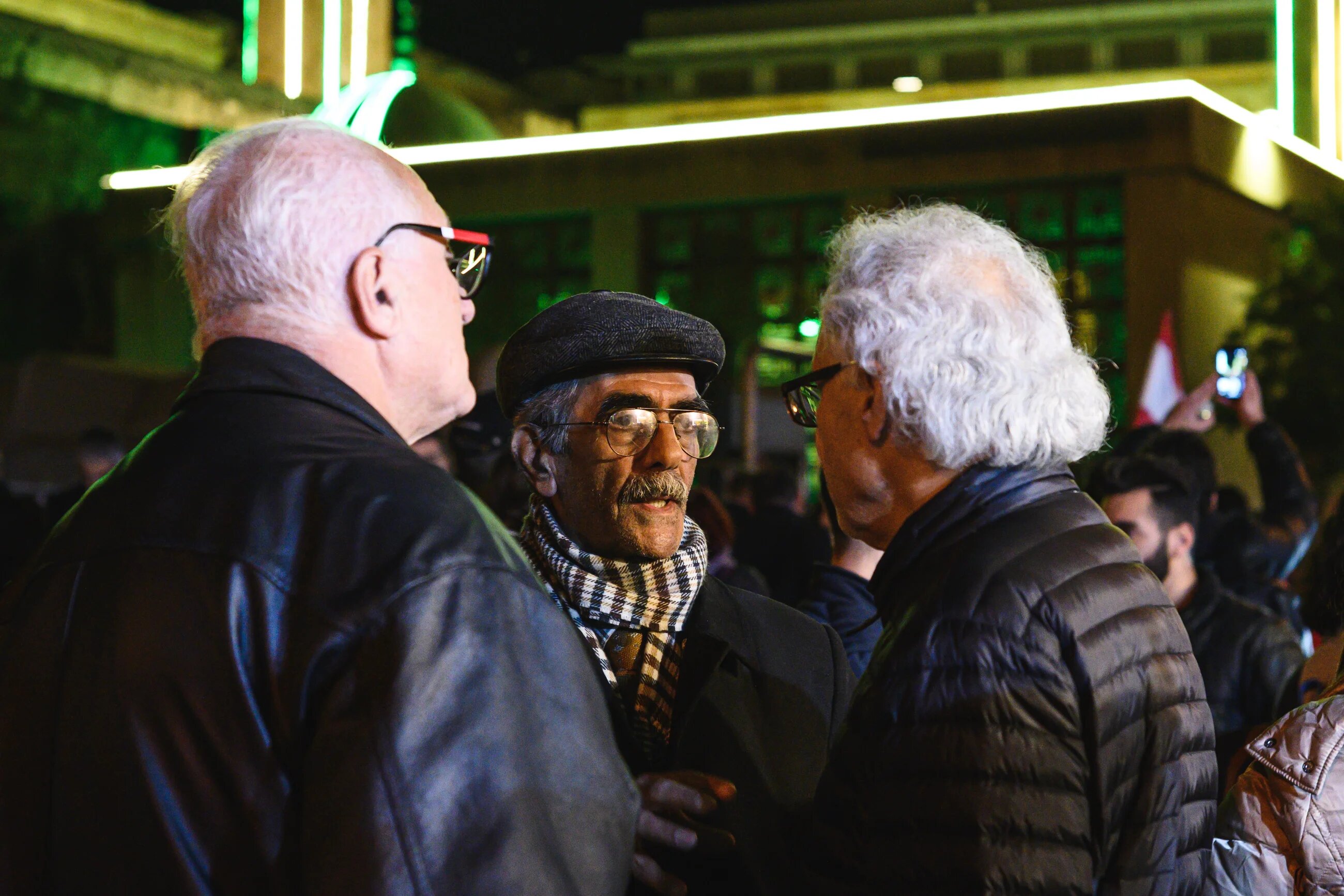 Three elderly men chat in front of the al-Omari grand mosque in Downtown on 14 December. Sunday night’s protests - against the possible reappointment of Saad Hariri as prime minister and the excessive use of force by security forces the night before - initially had a jovial atmosphere (MEE/Finbar Anderson)
