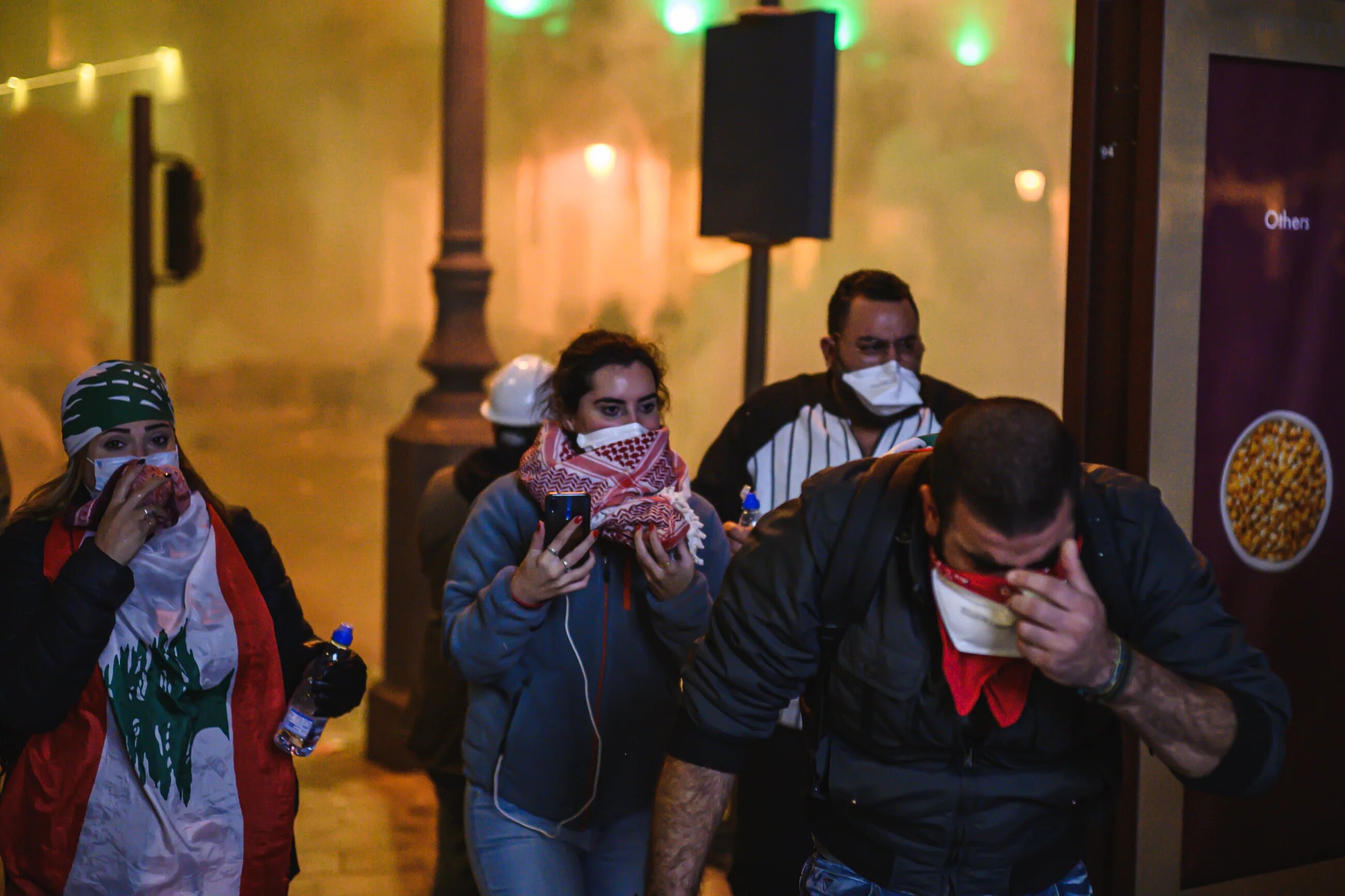 Anti-government protesters watch as tear gas canisters land nearby after being pushed back from the Downtown area to the corner of Martyrs’ Square on 14 December (MEE/Sam Tarling)
