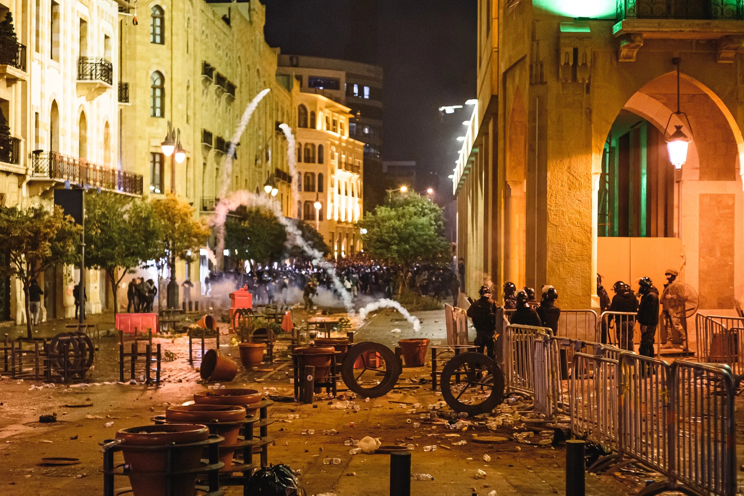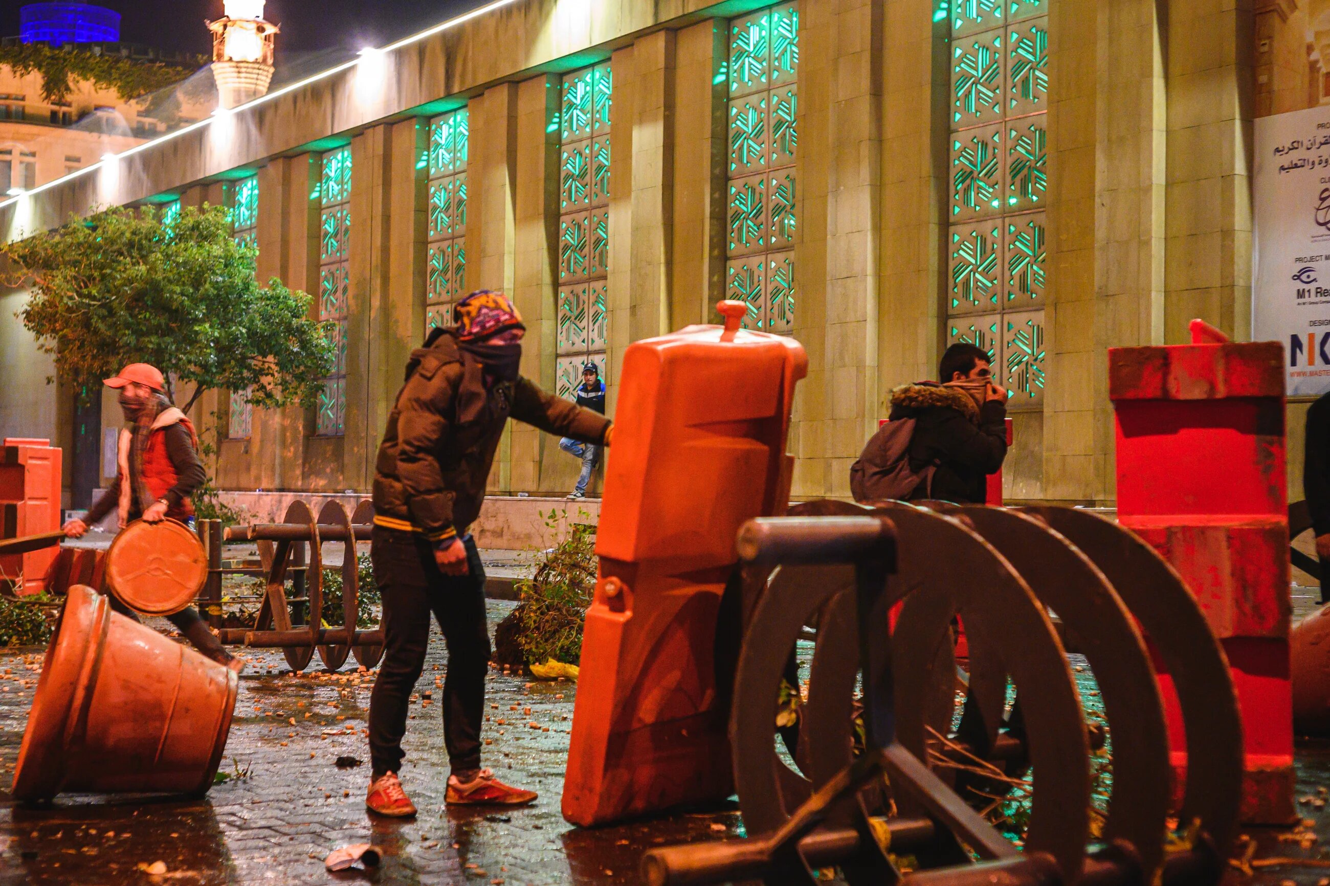 Protesters in downtown Beirut take cover behind plastic barriers, flowerpots, and other objects on the street during clashes with Internal Security Forces on 15 December. This exclusive area of the Lebanese capital, normally one of the best maintained parts of the city, was left in chaos (MEE/Finbar Anderson)