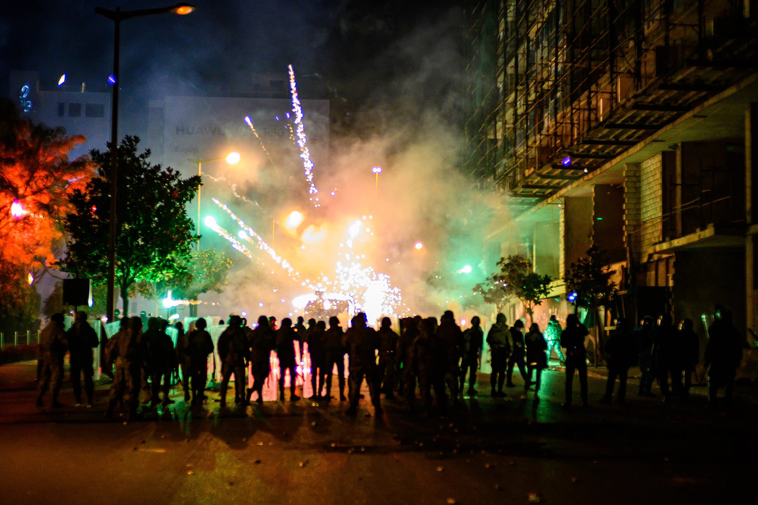 Security forces watch as a water cannon, attempting to disperse supporters of the Amal Movement and Hezbollah, is attacked with a barrage of fireworks during the early morning of Tuesday, 17 December. Supporters of the groups took to the streets of Beirut en masse Monday evening after a video surfaced online of a man, claiming to be from Tripoli, insulting senior Shia religious figures and the leaders of the two parties (MEE/Finbar Anderson)