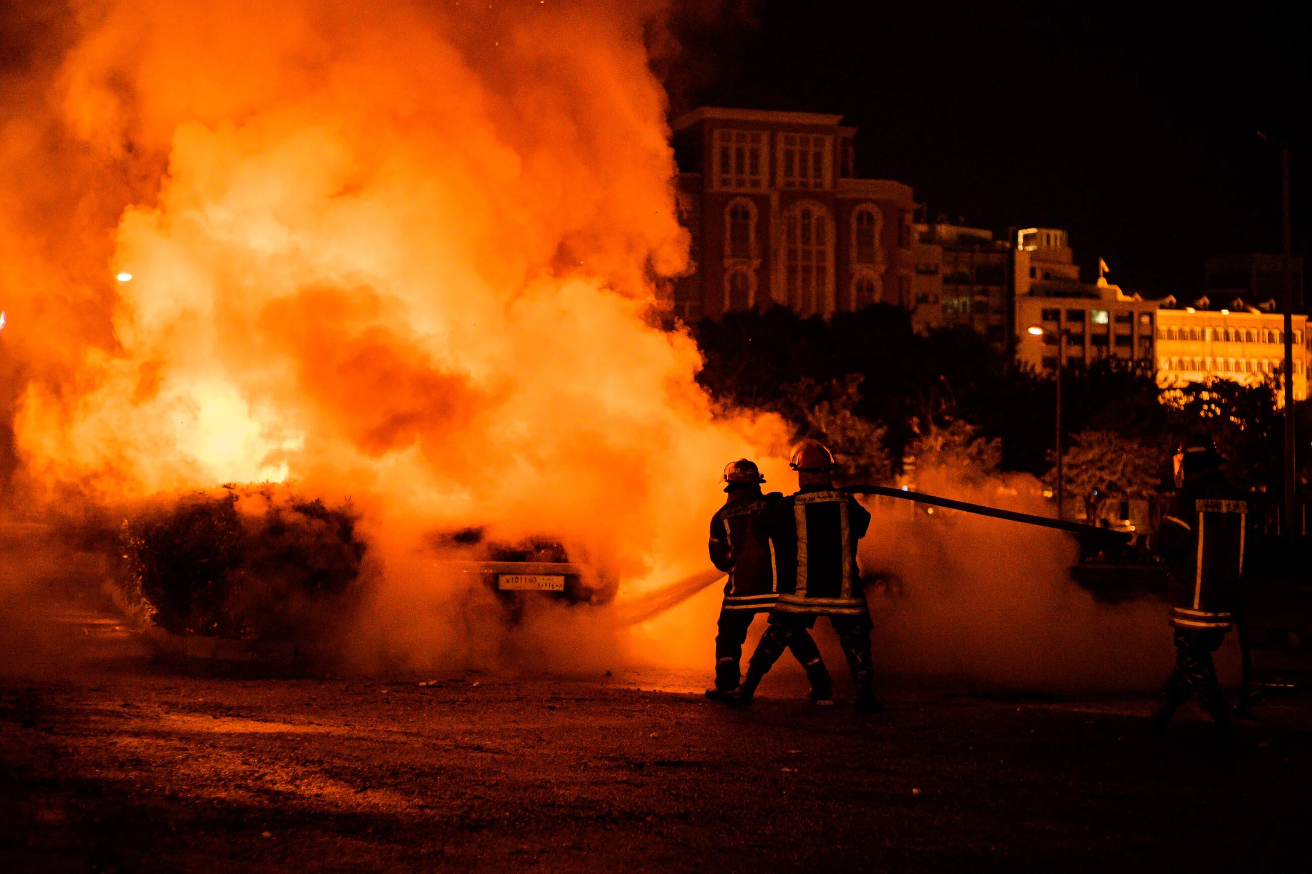 Firemen battle to put out a burning car in the early hours of Tuesday, 17 December. The Amal Movement and Hezbollah supporters burned a car after it attempted to ram into them at high speed, and then set alight another car - pictured - around an hour later (MEE/Finbar Anderson)