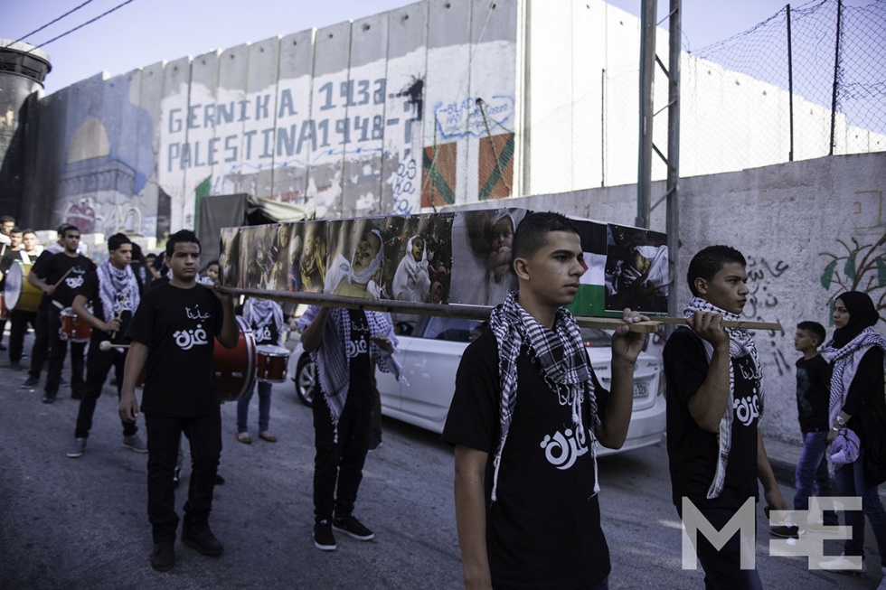 By 8am the next morning, the steady beats of Aida’s keshafa programme, a youth-led drum line reverberated throughout the camp's tiny alleys and concrete enclaves as younger children followed with signs demanding an end to Israeli war crimes.
