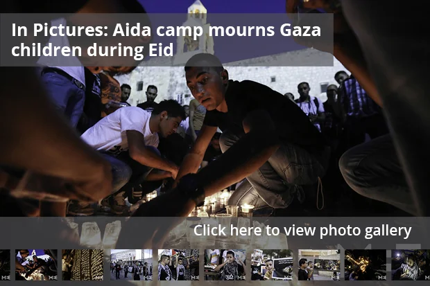 The following night, dozens were bussed from the camp to Bethlehem's Nativity Church where a vigil was organised in solidarity with Gaza. Again largely led by the camp's youth, participants lit candles spelling, “Gaza,” while Aida Camp’s local DJ amplified the voices of two girls demanding justice from various world leaders and organisations.