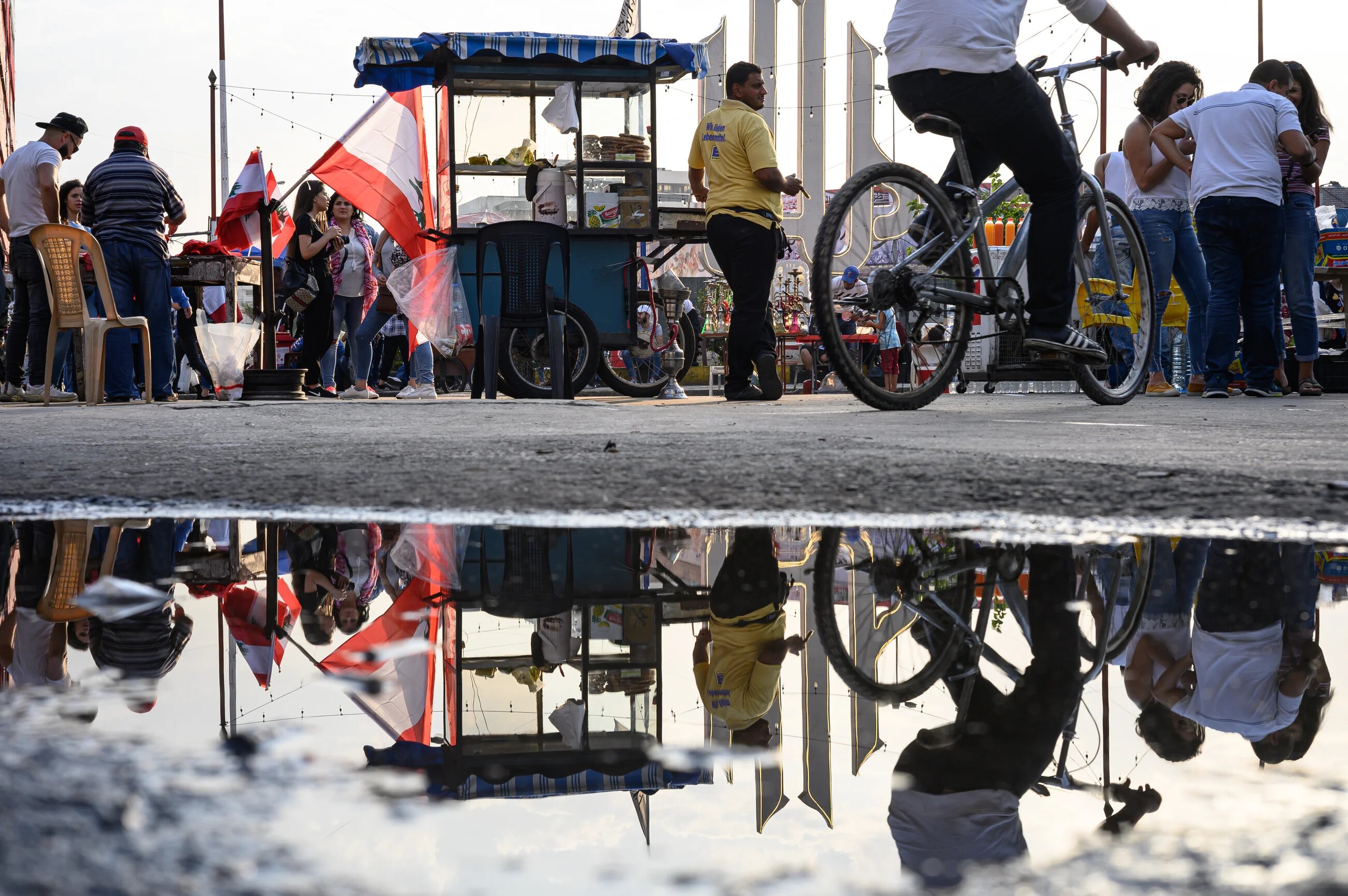 A cyclist rides past a ka’ak flatbread vendor’s cart as Tripoli’s Sahet al-Nour square waits to fill up before evening protests (MEE/Finbar Anderson)